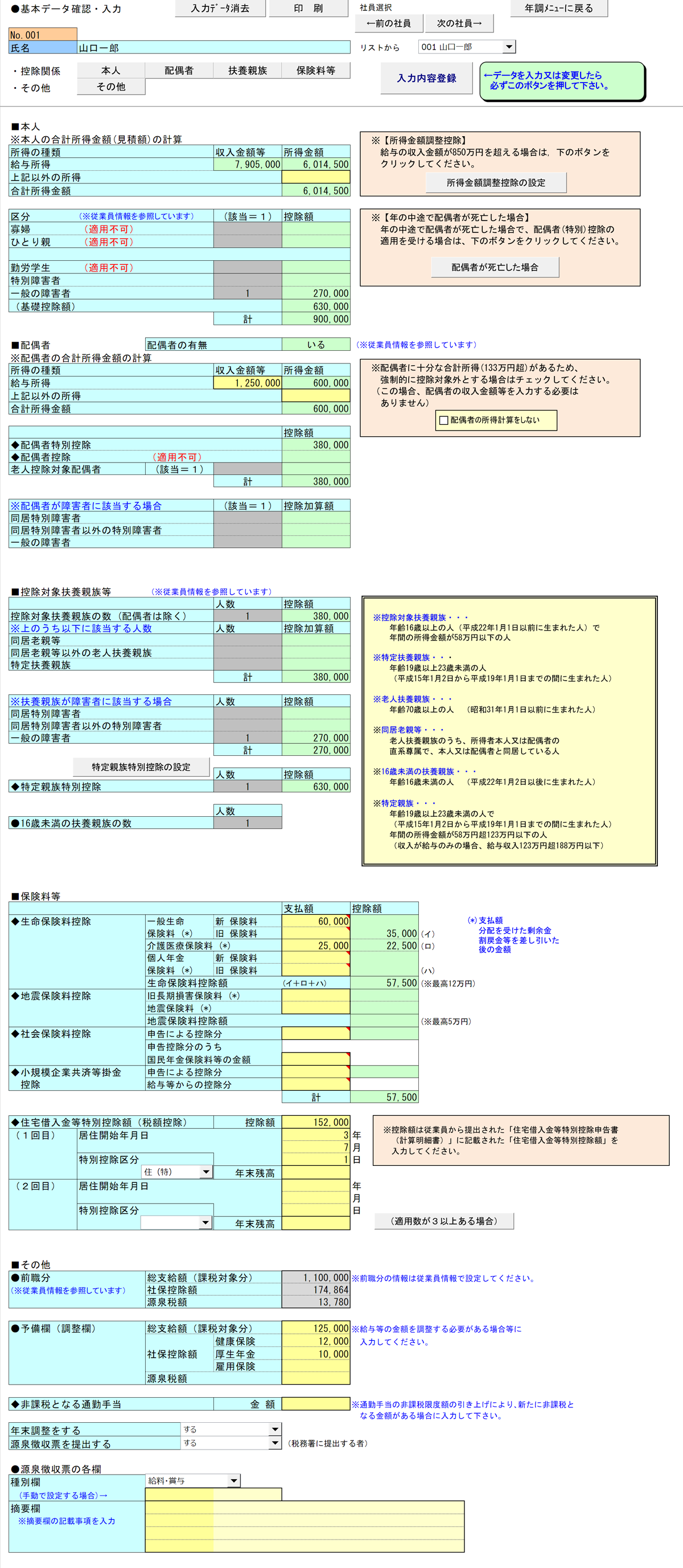 配偶者の有無・扶養親族の数は従業員情報[1-3]と連動しており、それぞれの控除額が表示されています。