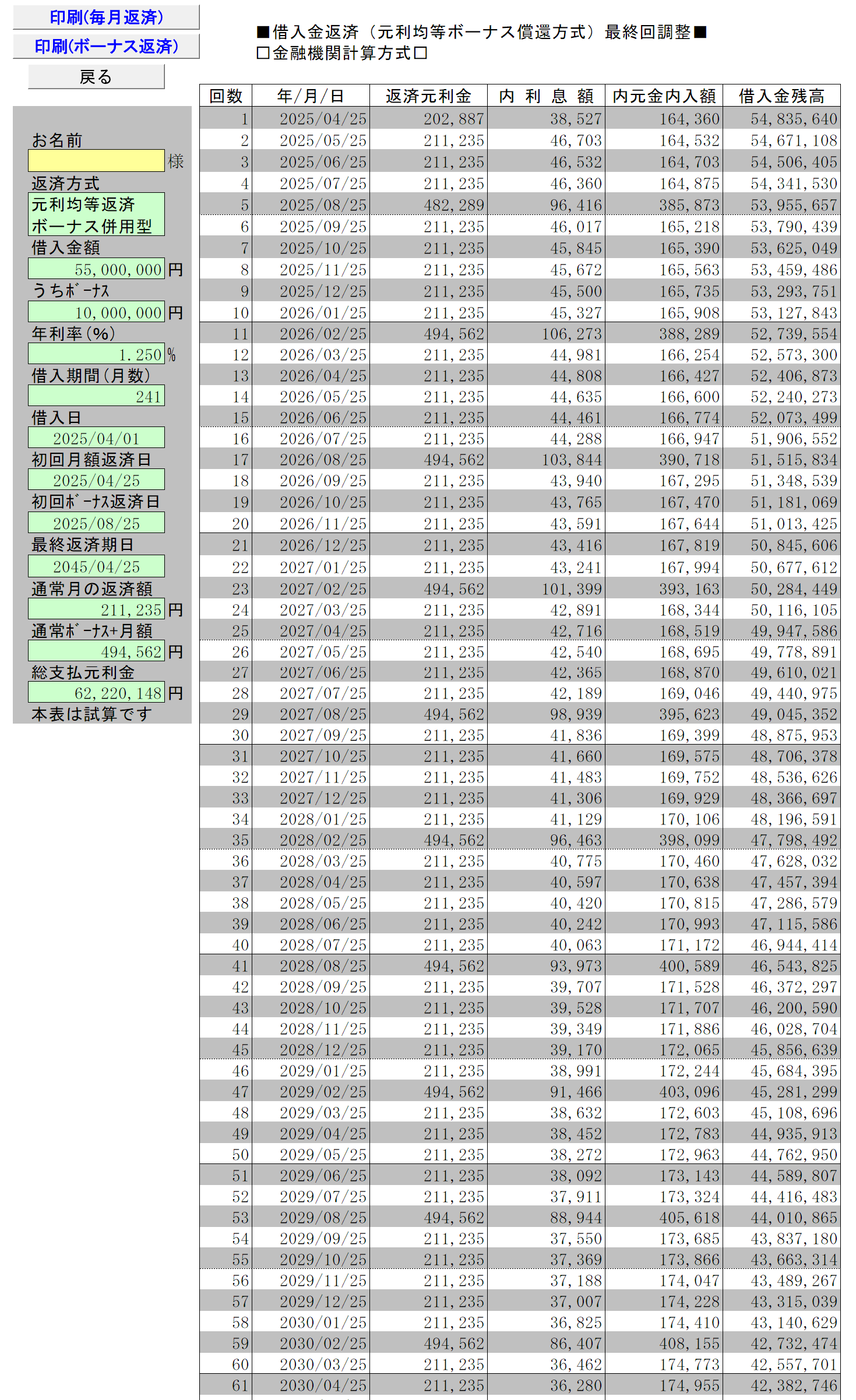 このプログラムは各年ごとの控除税額を計算し、控除前と控除後でどの程度所得税の減税効果があるかを試算します。
