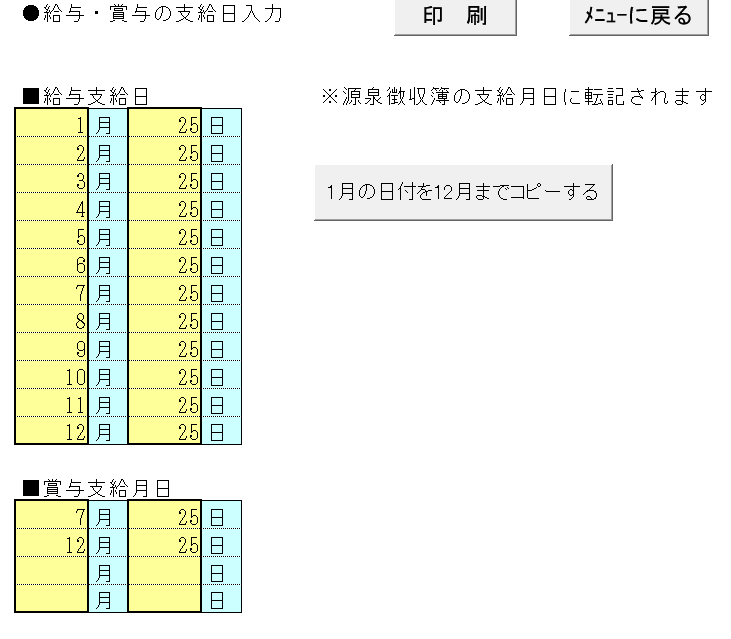令和7年の給与・賞与の実際の支給日を入力してください。[1月の日付を12月までコピーする]ボタンをクリックすると1月に入力した日がすべての月に反映されます。