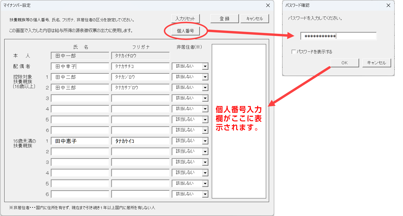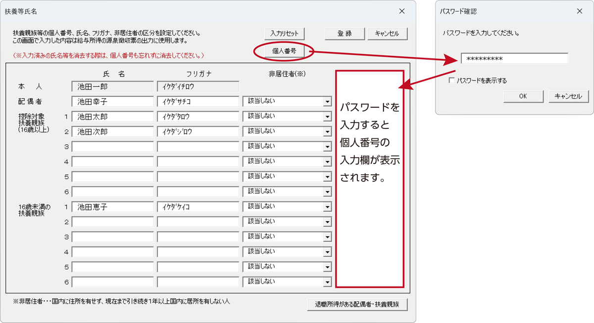 マイナンバー関連事務(登録・編集・印刷)を行うには、マイナンバー作業用パスワードの設定・認証が必要となります。パスワードを知らない場合、通常の年末調整は行えますが、マイナンバー関連事務はできません。
