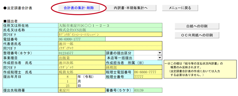 法定調書合計表入力画面の上にある「合計表の集計・削除」ボタンをクリックして集計を行ってください。