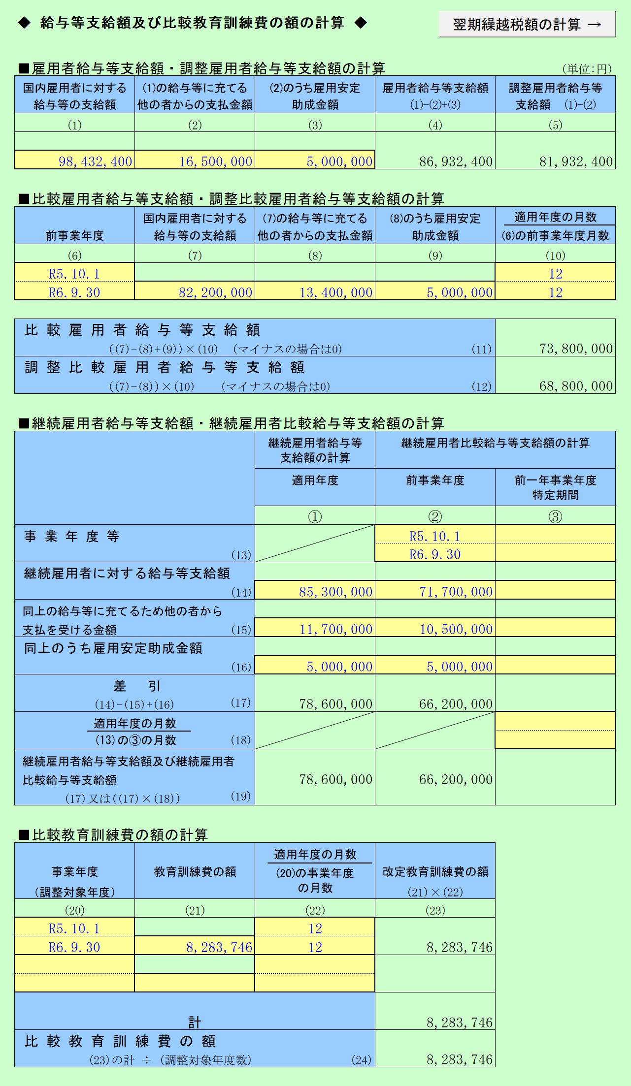 法人税申告書別表六(二十四)「給与等の支給額が増加した場合の法人税額の特別控除に関する明細書」の計算をするシートです。