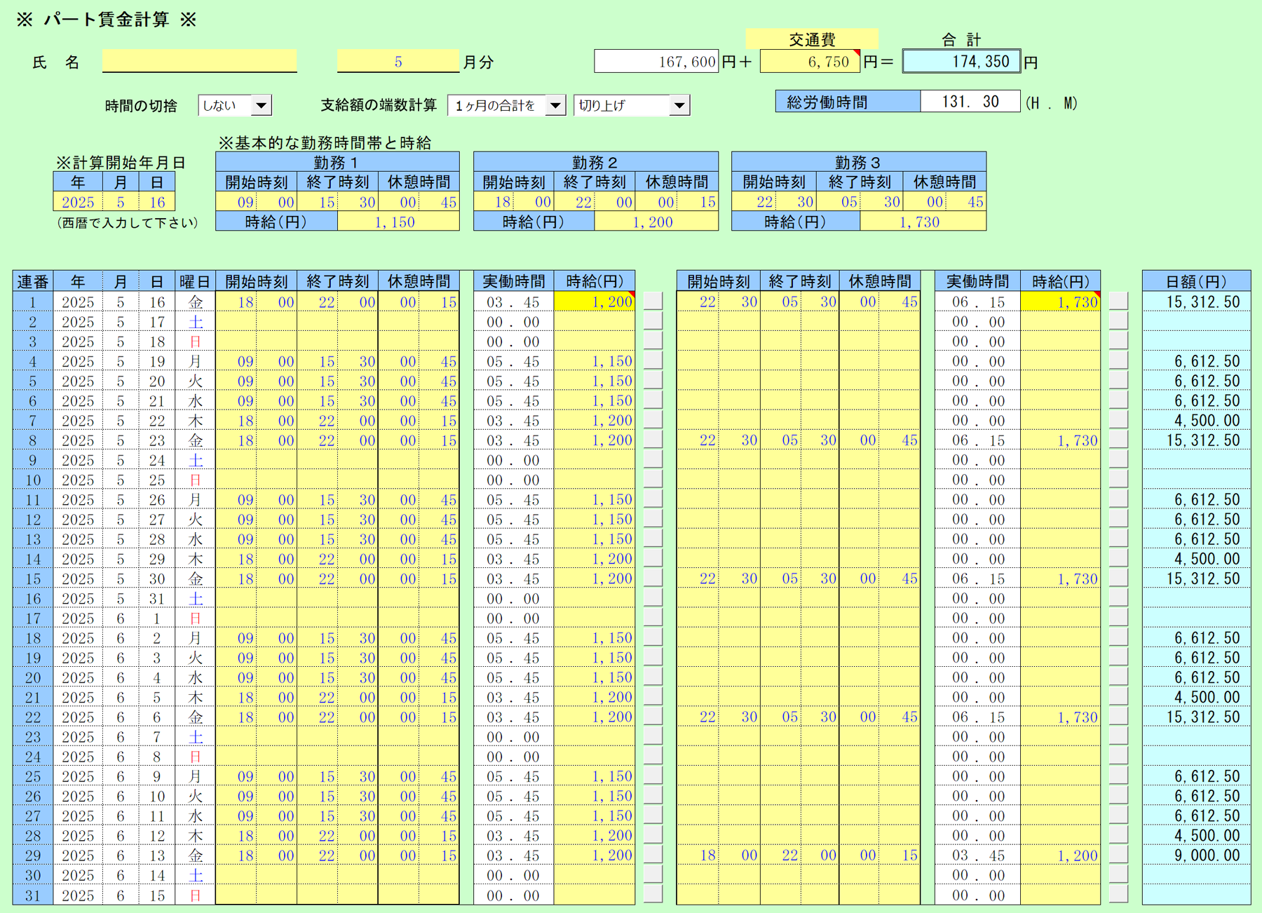 タイムカード形式で始業時間と終業時間・休憩時間を入力すれば、就業時間の合計を算出し、時給を入力すれば支給額を算出できますので、パート社員の給与計算を手計算でする場合に比べて大幅な事務労力の合理化が可能になります。