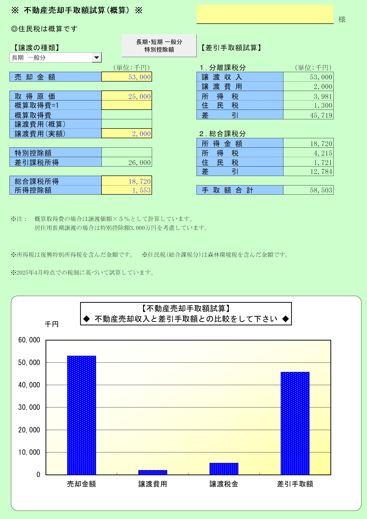 売却(予定)代金と譲渡所得の所得区分を入力することによって、概算ながら、売却に伴う譲渡費用、譲渡所得税・住民税を即座に算出し、不動産の売却によって最終的に手元に残る金額を計算します。